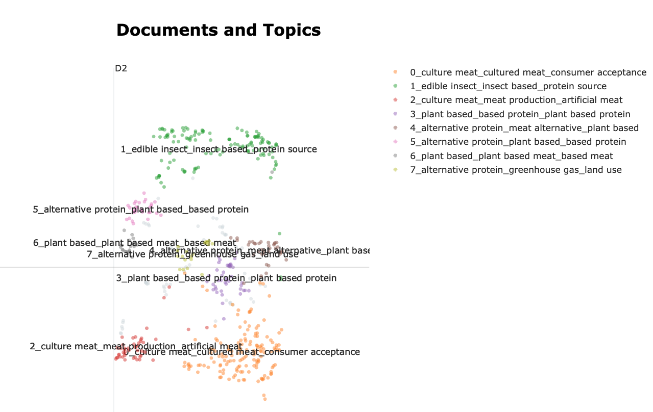 topic_model.visualize_documents(data)This creates the visualisation, in which each point on the map is a document. The closer the points, the closer the text is (semantically). When points have the same colors they are considered a topic. The name of the topic is built from the top words of each topic.