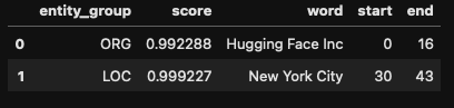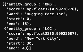 test_text = "Hugging Face Inc. is based in New York City. They were founded in 2016."Then we supply the text to the NER pipeline