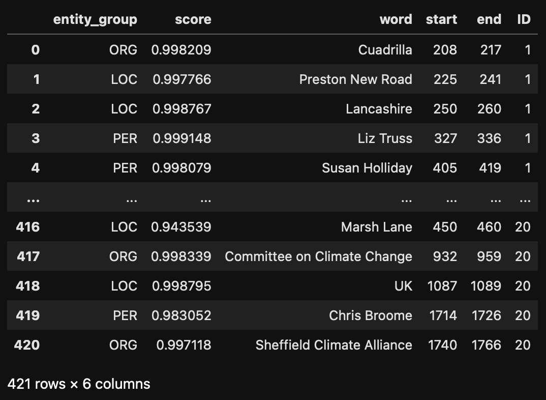 data = data.reset_index(drop=True)Because we are using a loop, we will need to add the results of the NER of each document to a dataframe that will have all the results. We create an empty list in which we will store these results.