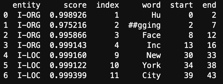 Suppose we have the following text: “Hugging Face Inc. is based in New York City. They were founded in 2016.” Then we would like to extract “Hugging Face Inc as an organisation. In the output below you will see that in fact that”Hugging Face Inc.” has been split into different tokens. start/end indicate the letter positions of the subtoken, the score is the confidence the model has in the classification (I-ORG for organisation, I-LOC for location).