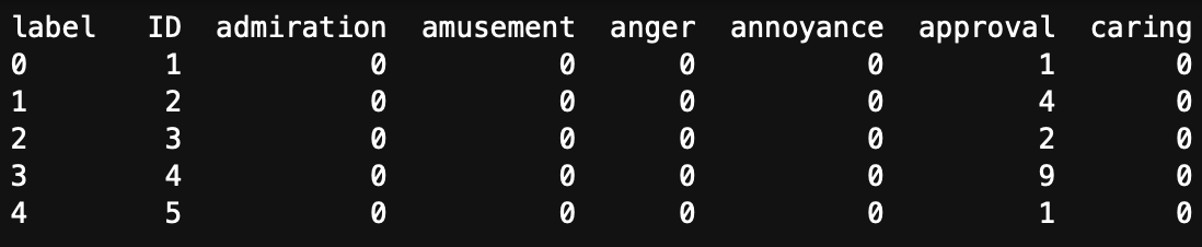 emotion_counts_per_document = emotions.groupby(['ID', 'label']).size().unstack(fill_value=0).reset_index()This give the dataframe in Table 1. Now we need to divide all the columns by the number of neutral sentences. Note that the screenshot in Table 1 only shows part of the dataframe, in reality it has 27 columns, the last one has the number of neutral sentences.