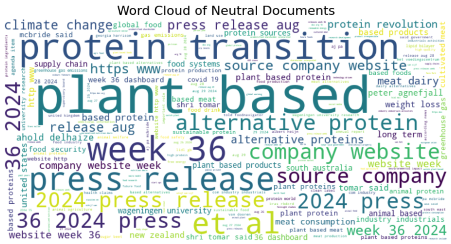 The neutral documents contain different types of articles, we see information from company websites, press releases, and word related to urls and websites. We could argue that many of these articles should be removed from the dataset since they do not necessarily contribute to the types of analysis we want to run. Another choice to make!