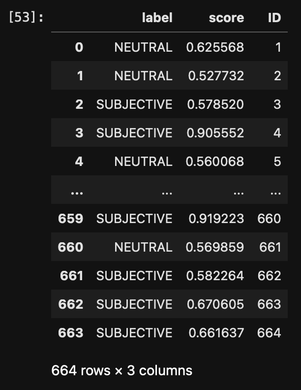sub_obj = pd.concat([sub_obj, tmp], ignore_index=True)sub_obj contains the output of the model for each of the documents: