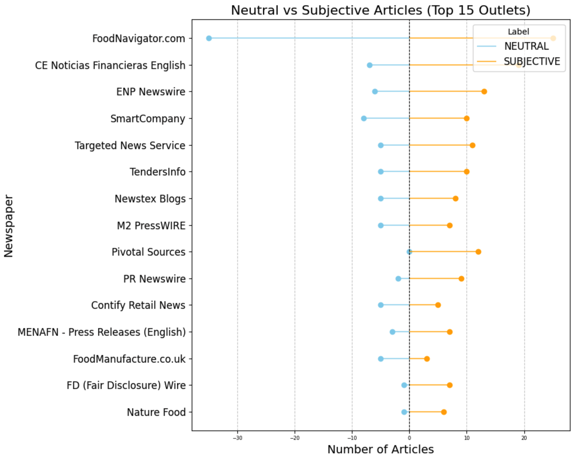Let’s push the analysis a bit with some other data. We know which newspaper published each article. Let’s see the balance of neutral/subjective per outlet: