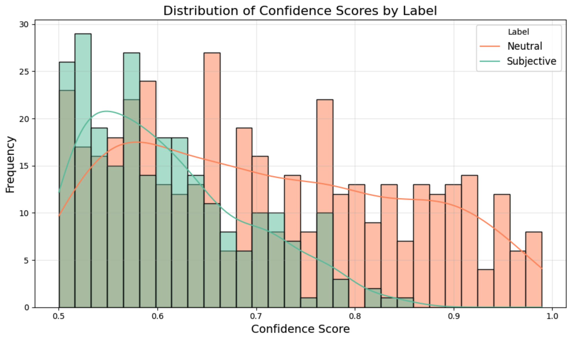 Notice that there is no confidence score below 0.5. This is the case because we have a binary classifier here, so anything below 0.5 is considered to be part of the opposite class. We do see that the classifier gives much higher scores to neutral documents than it does to subjective documents. It’s easier to class something as neutral, subjectivity is less clear-cut. It’s always good practice to read a couple of the lower confidence documents to assess whether or not they are correctly classified. If not, you can subset the set to a higher score.
