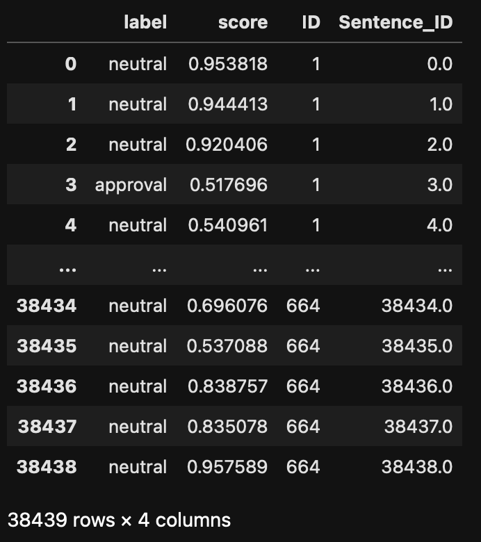 emotions.to_csv("emotions_results_persentence.csv", index=False)The result is a dataframe of the following format. Notice that we have an ID for each sentence and an ID for each document.