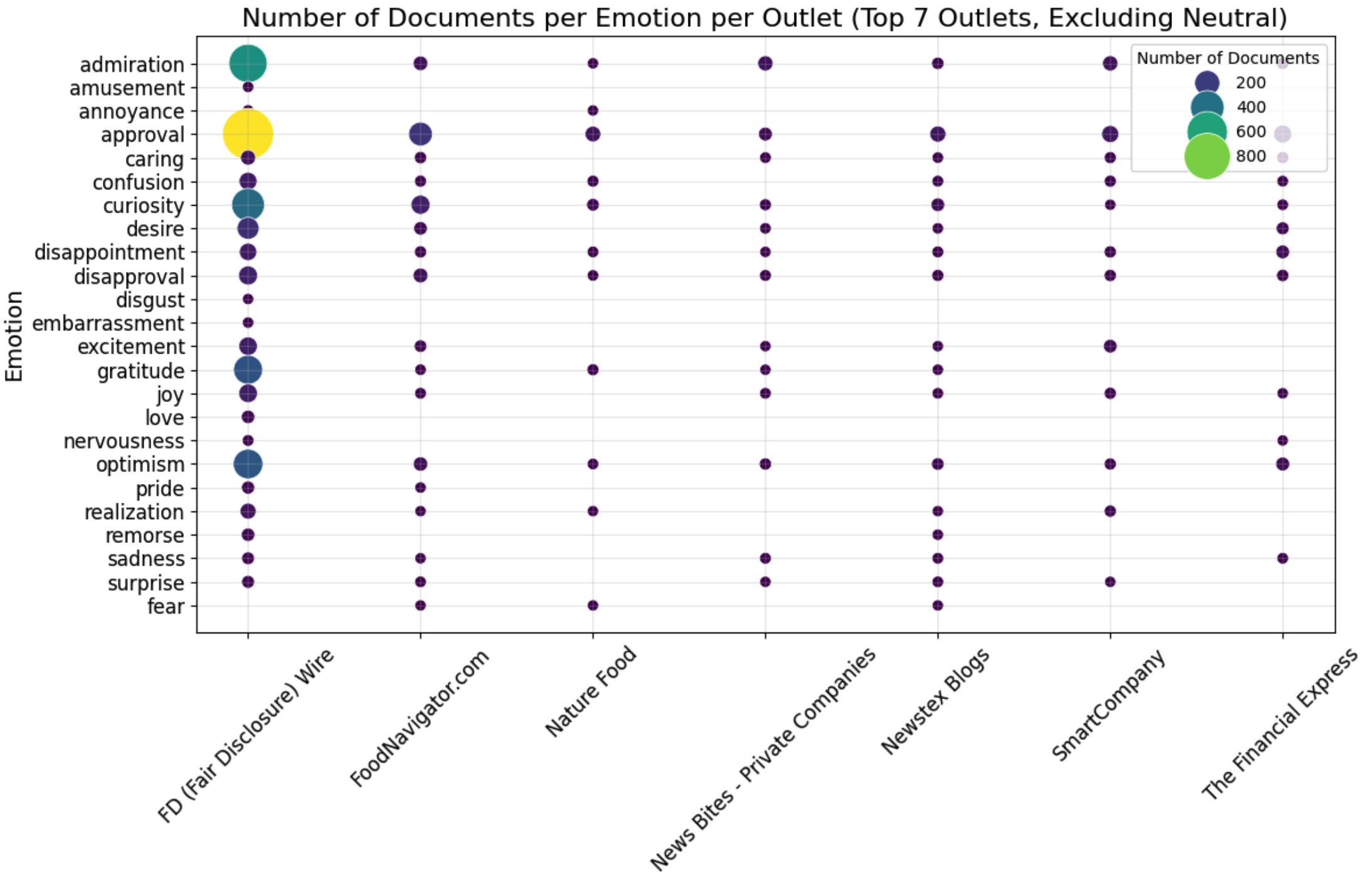 The results show that a large portion of the articles are classified as approval. For our context this shows that the content of the articles is largely approving of steps related to the protein transition. The second emotion is amusement, showing that in the end there are still some elements of novelty to new protein sources that evoke this emotion.
