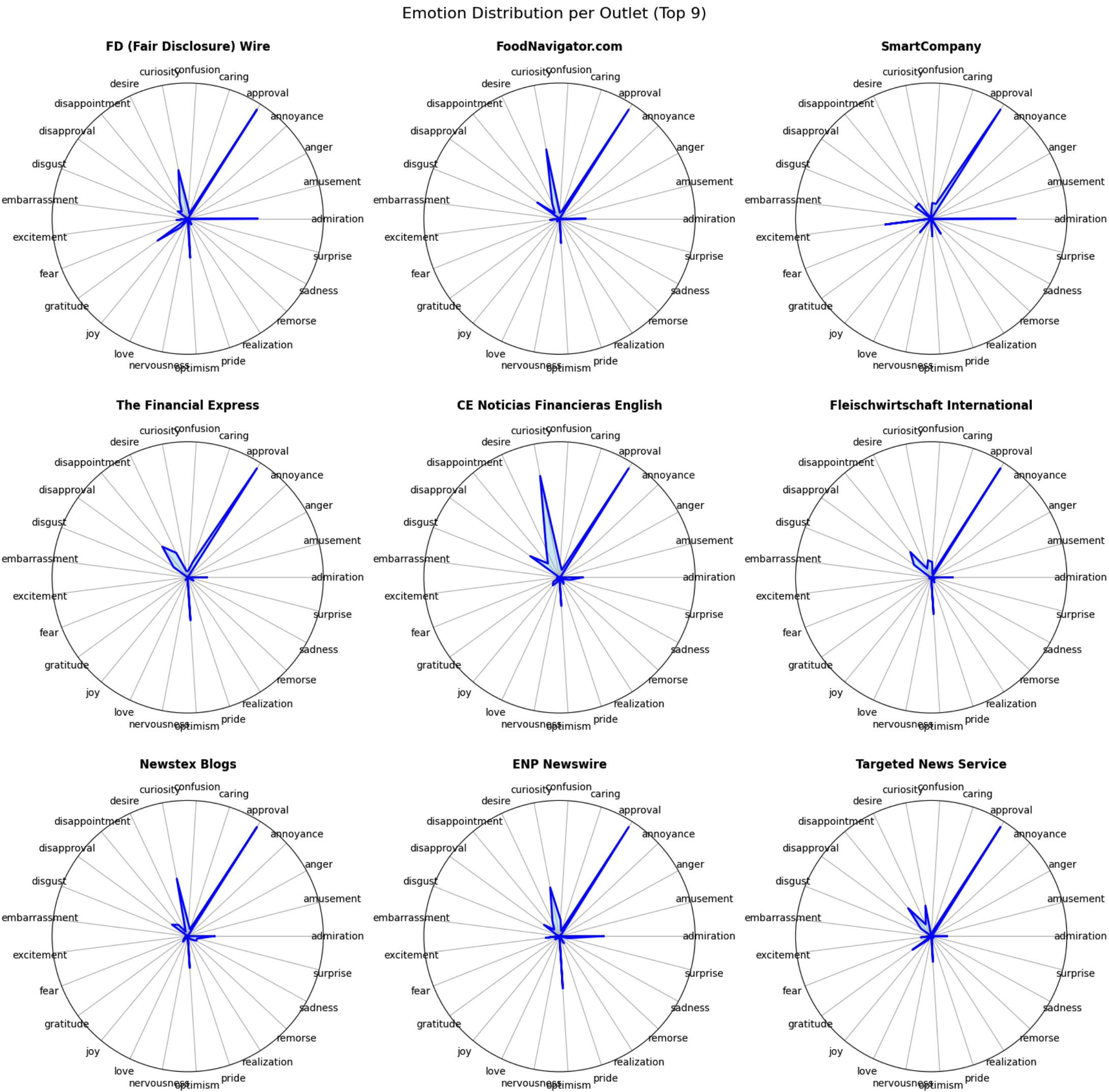 We can also compare profiles by creating radar plots. You can make these more readable by removing emotions from the radar, adjust what suits your analysis!