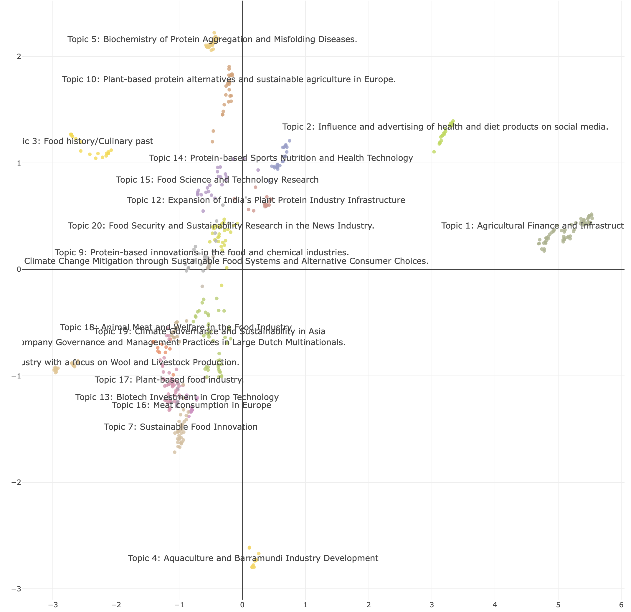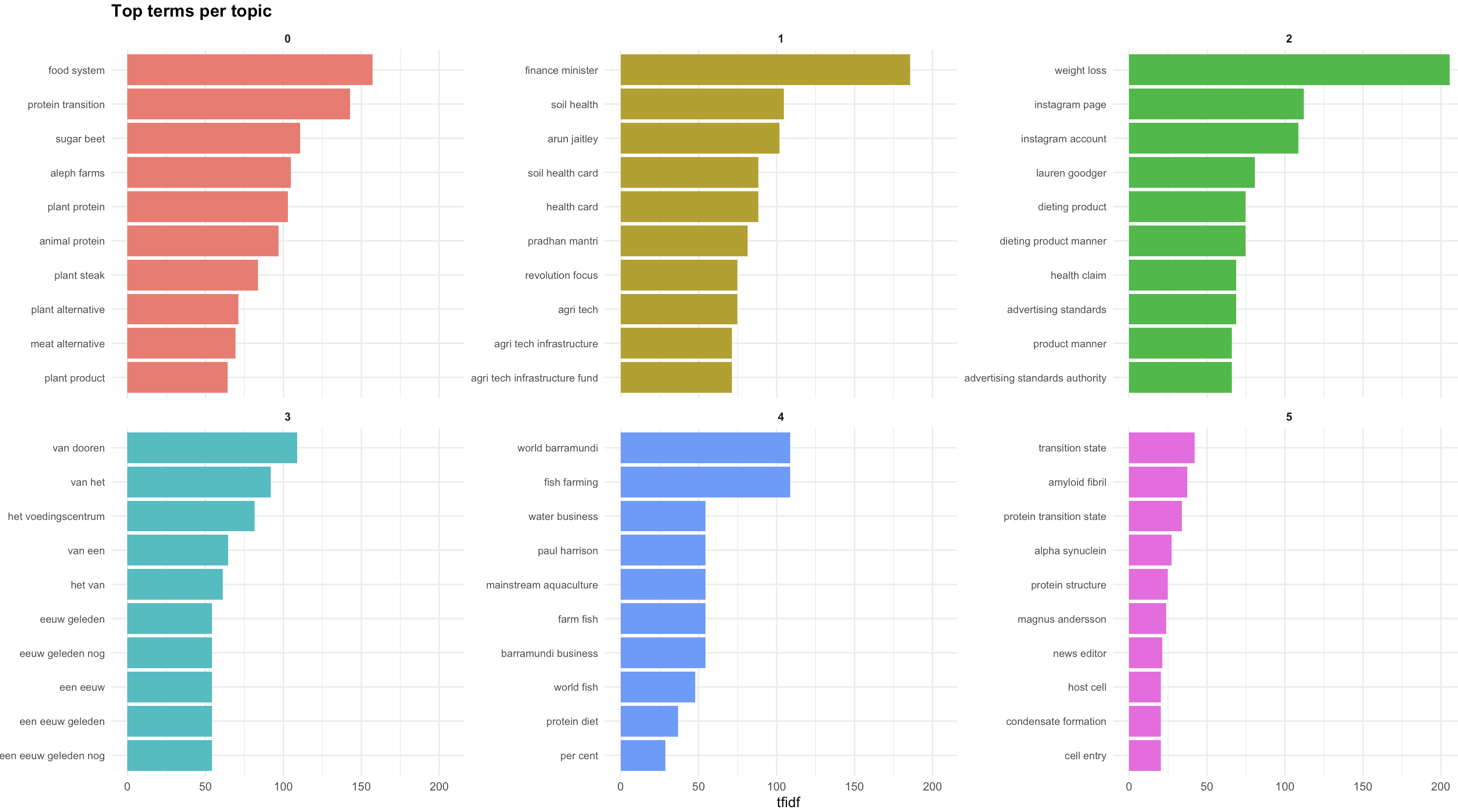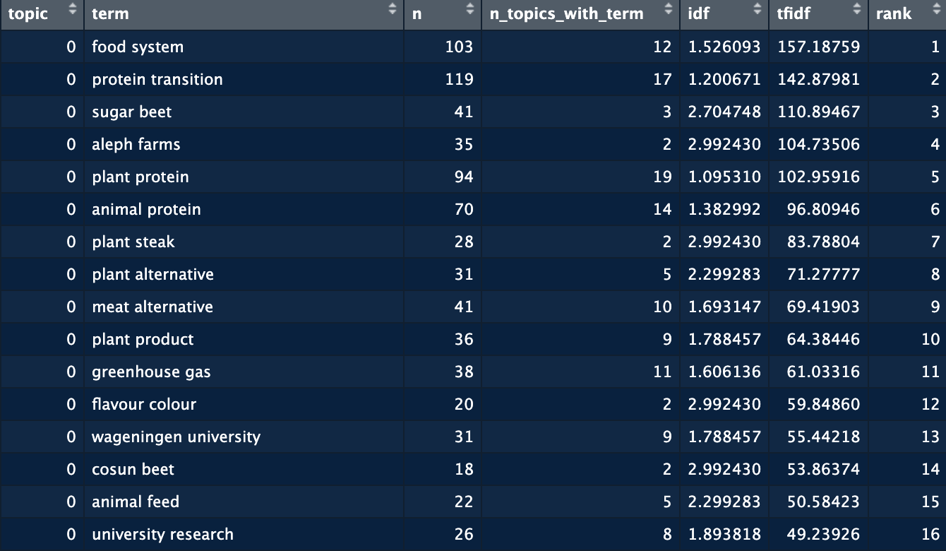 The output of this function is shown below. For each topic, there are a number of top terms and their associated scored. This dataframe gives you the entire list of terms for all the topics. We can here see that topic 0 relates to food systems, protein transition, sugar beets and aleph farms.