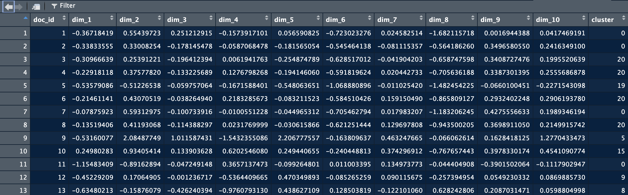 Here you see that we keep doc_id as the reference. Each dim_ column has the coordinate for one dimension in the space. There are as many dimensions as you put in the topic model extraction.