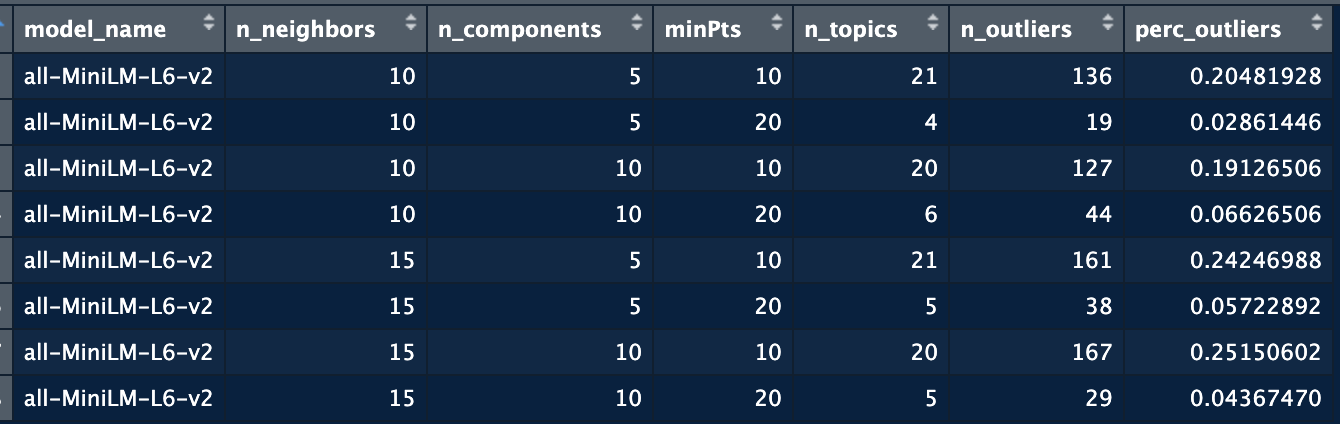 From all the previous steps, you will see that we often need to check different combinations of parameters before we find a space that is well divided. We might also want to test different embedding models. Using the **identify_topics_grid** function you can test different combinations of parameters and export some variables to see the performance.