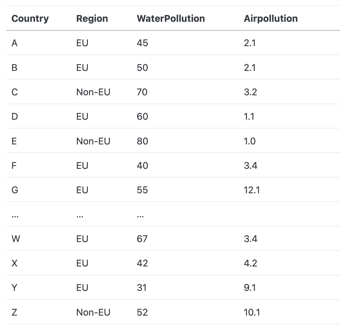 You are provided with the following Python script. Explain each line of code in this script. We have a csv file with different measure of water pollution in different countries in the world. There can be multiple measures per country (countries can have multiple water bodies). The values are fictitious. Explain each line of code in this script. There is no need to compute any values, or explain/show the output.