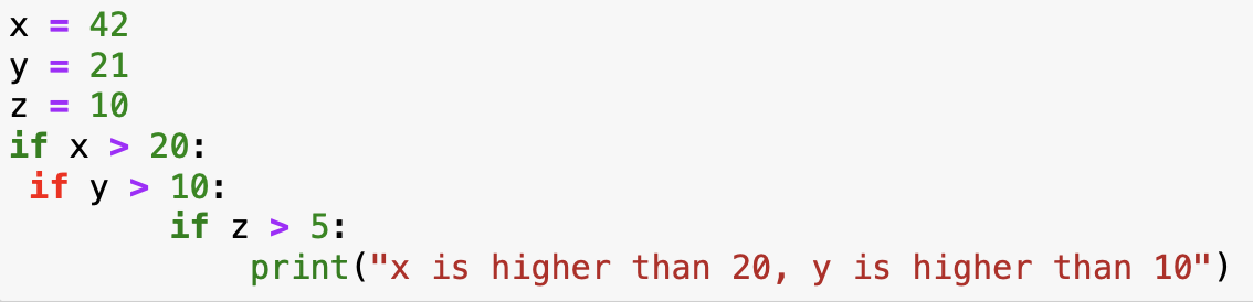 # since x > 20, this code will print "x is higher than 20"If you see an if statement turn red in jupyter, your indentations might be off. The code could still run, but you should solve this issue to avoid problems later on. The usual indentation is a tab. The second level, two tabs and so on.