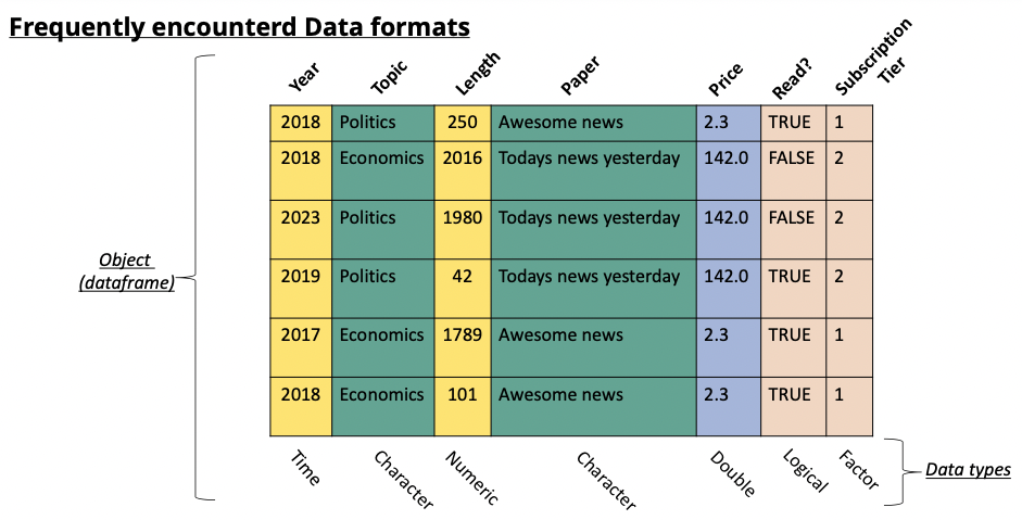 When working with data, we face different data object types. In practice we will mainly use the following formats: