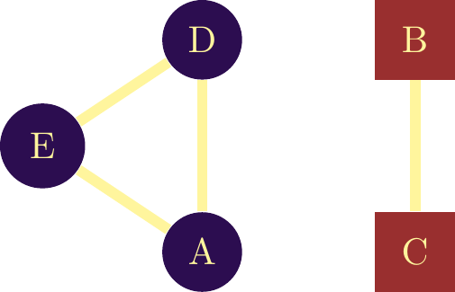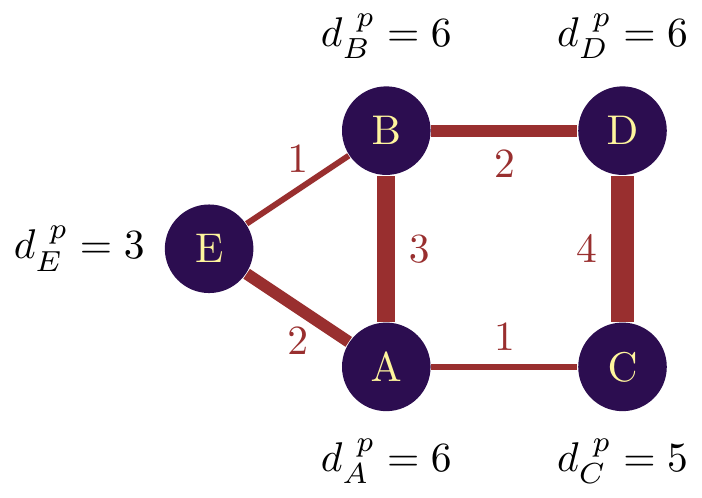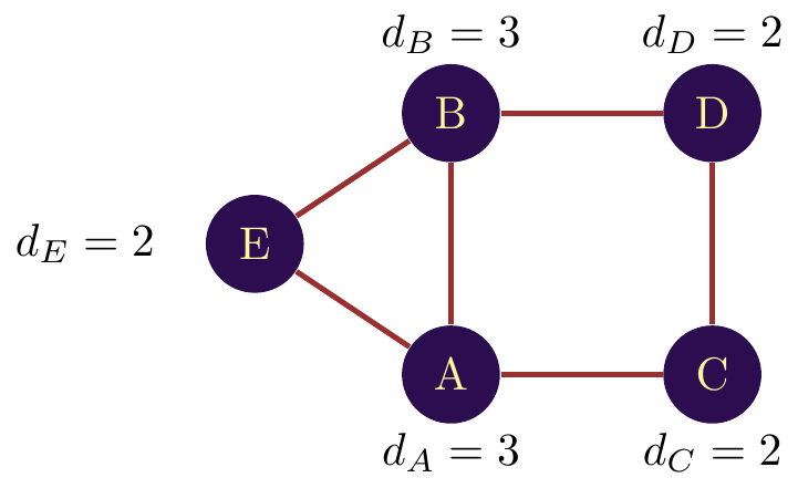 In the example of the network in figure \(\ref{fig_ind_degree}\), node E has two connections (with and ), so its degree is 2. We then note \(d_E = 2\). The nodes and have a degree of 2, and a degree of 3.