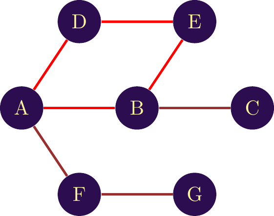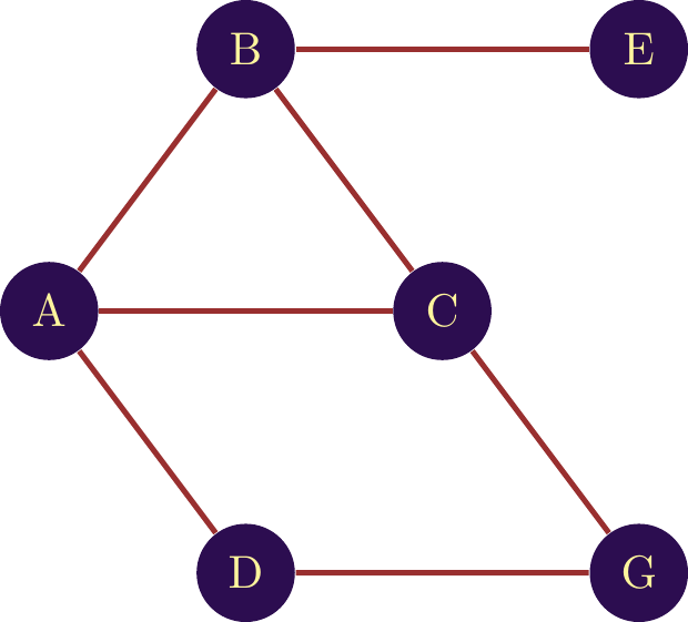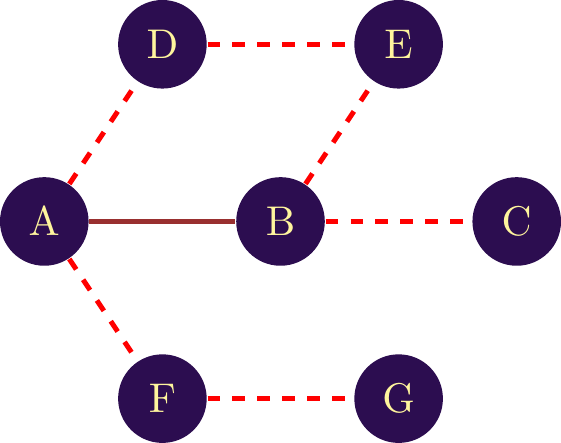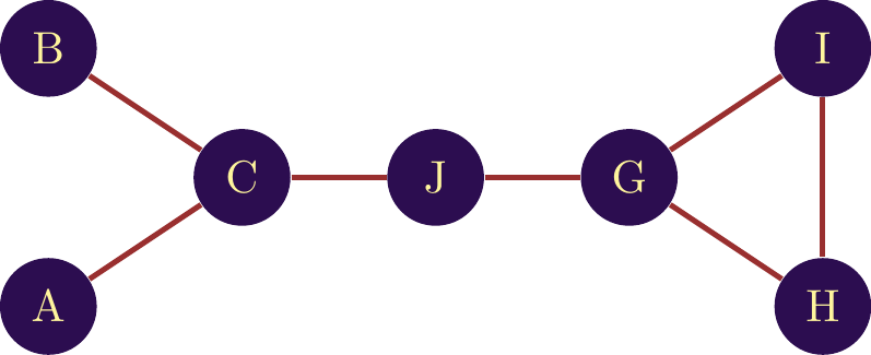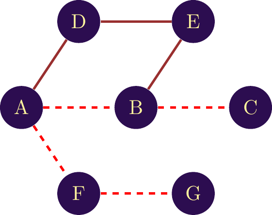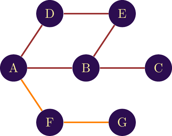 In network analysis, a is a sequence of nodes through which you must pass to reach a given node from a given node. Suppose we’re looking for a path between node and node in the network shown in figure \(\ref{Notion_de_chemin_bilat}\). As the network is undirected, we can take the direction of the link as we wish. Thus, we start from node to node , then continue from node to node . The path connecting nodes G and A is therefore G, F, A.