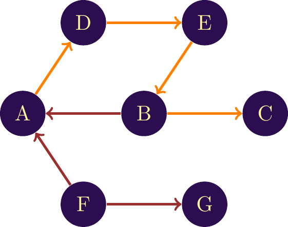 If the network is directed, a path follows the direction of the links. So, in figure \(\ref{Notion_of_path_unilat}\), the only path between and is A \(\mapsto\) D \(\mapsto\) E \(\mapsto\) B \(\mapsto\) C. Since the link between A and B is in the opposite direction, we cannot go from A to B directly.