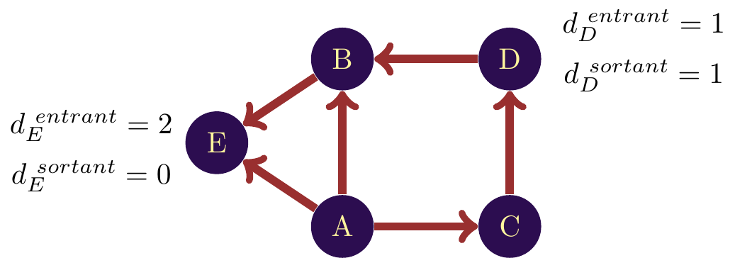 For example, in figure \(\ref{Reseau_degre_dirige}\), the incoming degree of node is \(2\), since two links point to it. Since no links point to other nodes from \(E\), its outgoing degree is \(0\). The logic is therefore the same as for the classic degree, with the only difference being the directions.