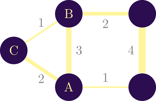 It’s possible to observe a link in a network that points from a node to itself. This is called a \(\textbf{loop}\) and is represented in figure \(\ref{nw_simple_non_dirige_pondere}\) by a red broken line. Let’s assume that each node in the illustrated network represents a country, and each link represents collaboration between players in the territory. The network shows us that two actors from country \(\textit{A}\) collaborate with actors from country \(\textit{C}\). In this context, the loop indicates that actors in country \(\textit{C}\) are also working together.
