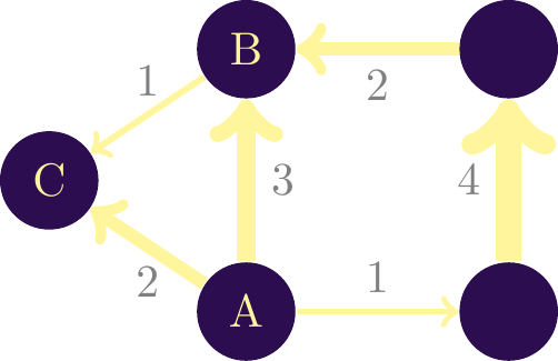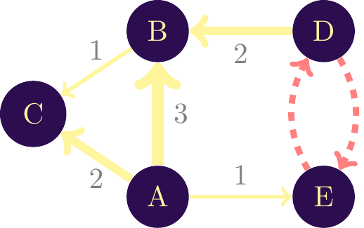 In this illustration, the node \(\textit{A}\) interacts with three other nodes, with varying intensity. However, no node interacts with it. Node \(\textit{B}\), on the other hand, both receives and gives interactions (with node \(\textit{C}\)). Suppose we’re dealing with a financial network in which each node is a bank account held by an individual. In this case, node $textit{A}$ sends money to three other individuals, sending the largest amount (3 units) to node \(\textit{B}\). The latter receives money from two individuals and sends money to individual \(\textit{C}\).