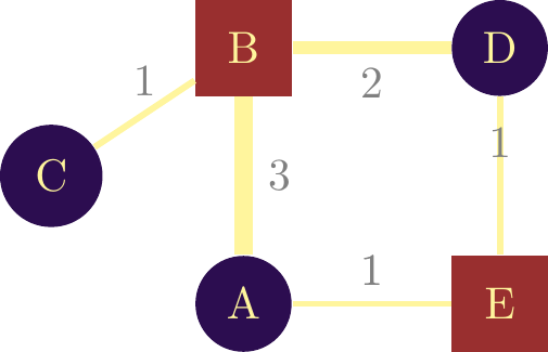 Let’s assume that the nodes in this network are companies, with black links representing collaborative links in patents, and red links representing collaborations in these scientific publications. We can read in this network that firm \(\textit{A}\) has co-authored a paper with firms \(\textit{E}\) and \(\textit{B}\) but has co-filed a patent with firm \(\textit{C}\). Although these are collaborative links in both cases, the implications are not at all the same. A collaborative link in patents implies an intellectual property parte, whereas publication shows above all a fundamental research activity between the two entities. A visual analysis here is interesting and relevant. However, the calculation of classic indicators would be wrong, as it considers both types of link to be identical. To overcome this problem, it is possible to create two networks from the first, each with only one type of link. The alternative relies on the use of more complex indicators, which are far more difficult to interpret and limit the impact these analyses can have on decision-making.