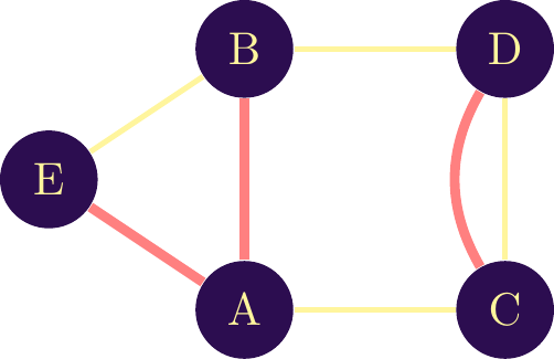 Let’s suppose we want to represent different types of interaction in the same network. This translates into the possible existence of two (or more) links between two objects in the same network. Figure \(\ref{Network_two_types_of_links}\) visualizes this idea with two links between nodes \(\textit{C}\) and \(\textit{D}\). The first link is shown in black, the second in red. A network containing different types of links is called a \(\textbf{multi-graph}\).