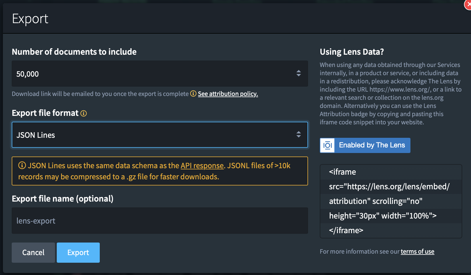 The format of the export is important since it defines the information that will be exported. The CSV format will have a lot of valuable information but does not contain textual information or geographical information for the patents. This is however information that we would like to work with. This means that we need to pick the jsonl file format, this is the only format that exports all available information.