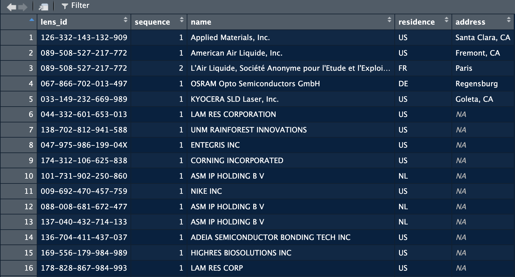 A data frame with these columns: - name: Assignee name (e.g., “Samsung Electronics”) - residence: Country (e.g., “South Korea”) - address: Address (e.g., “Suwon”)
