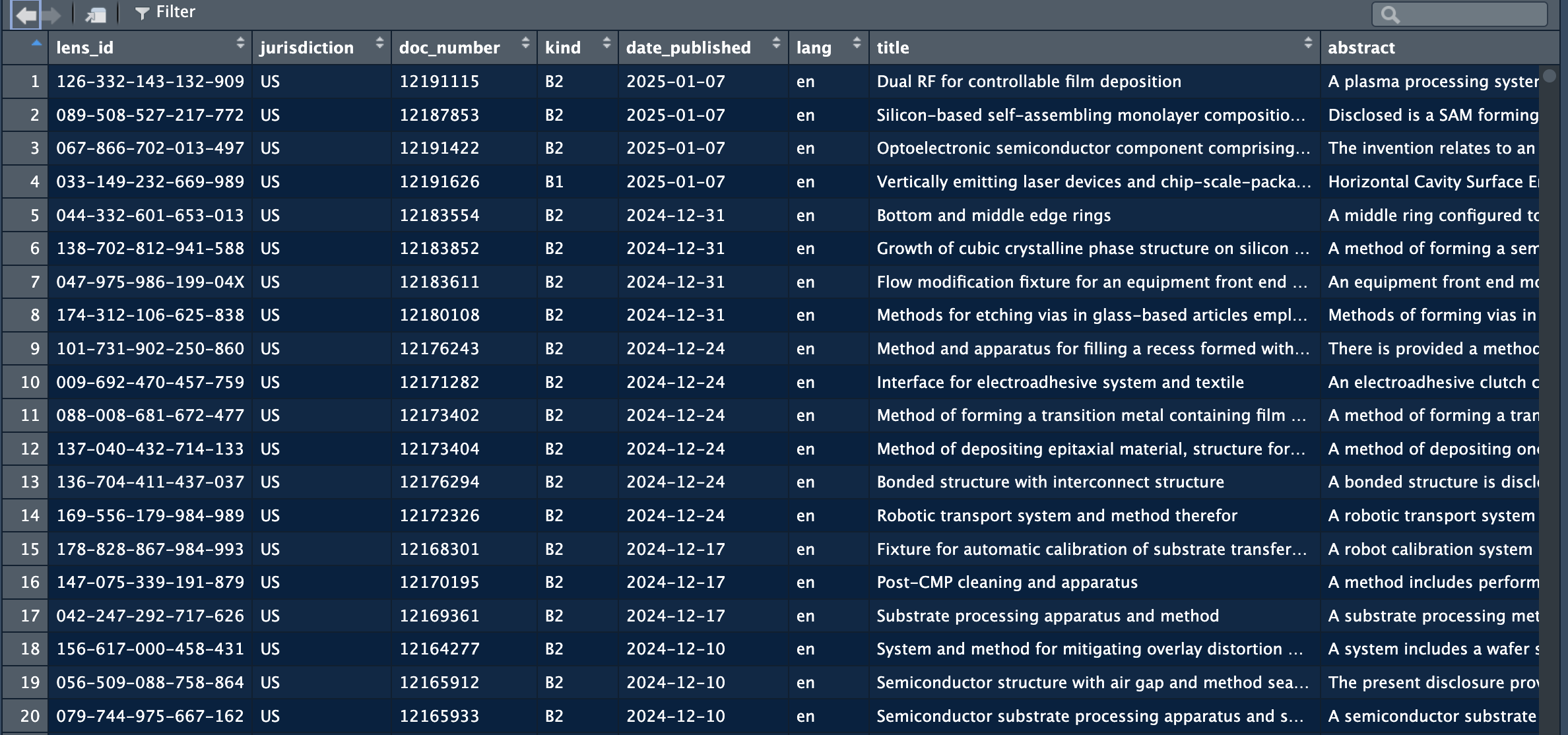 patents = process_patent_jsonl("/Users/janpieter/Patents")This function will create a dataframe with multiple variables:
