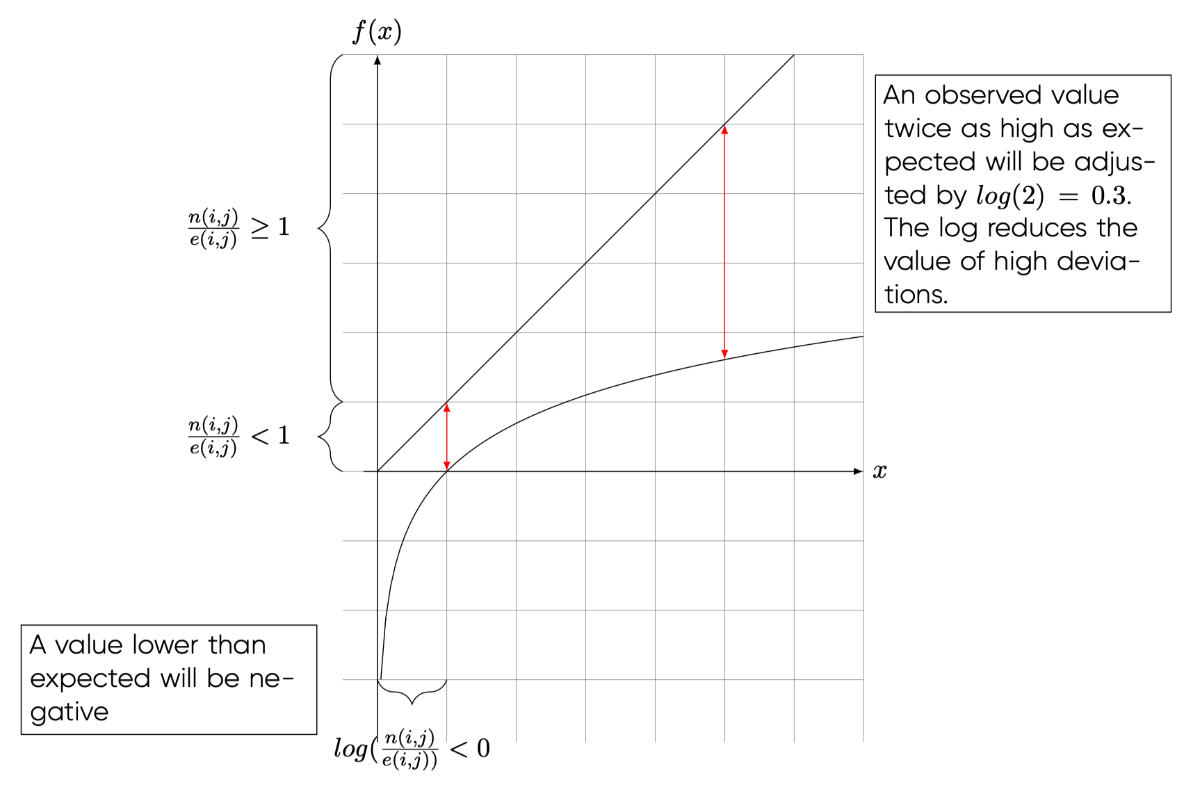 \[\begin{equation} I_{i,j} = log(\frac{n(i,j)}{e(i,j)}) \end{equation}\]More than a deviation from an observed value (like \(\chi^2\) or the Cramer indicator), Mutual Information identifies a multiplication. In other words, by how many times the observed number is greater than the expected number. The \(log(\cdot)\) function applied here initially transforms a value less than 1 ( value less than expected) into a negative value, while smoothing out high values. Figure \(\ref{information_criterion}\) illustrates this principle. A value \(> 1\) implies that the observed value is higher than expected and will receive a positive value. The log function reduces high values and in so doing also reduces the gaps between values.