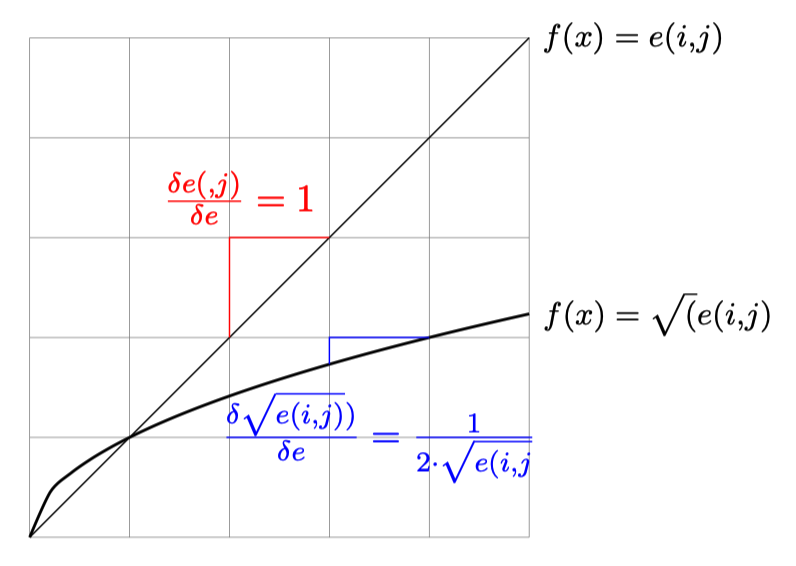We can see from this first part of the analysis that Cramer’s indicator reduces high expected values ( terms with high co-occurrences) to lower values in a more pronounced way than \(\chi^2\). A more important point is the marginal effect for each function. The marginal effect is constant for Cramer (\(\frac{\delta e(i,j)}{\delta e} = 1\)), so when we increase \(e\) by one unit, we increase the denominator by one unit too. In the case of \(\chi^2\) we have a decreasing marginal effect (\(\frac{\delta"\sqrt{e(i,j)}}{\delta "e} = -\frac{1}{4}e^{3/4}\)). This implies that for each increase in \(e\), \(\sqrt{e(i,j)}\) increases, but the increase is smaller and smaller. This means that the difference between the \(\chi^2\) values becomes smaller and smaller, while the Cramer values remain constant. In an analysis, \(\chi^2\) therefore brings fewer distinctions on strong expected values, whereas Cramer remains more “distinguishing” <- find a word here, it’s clearly not that, but I can’t find it.