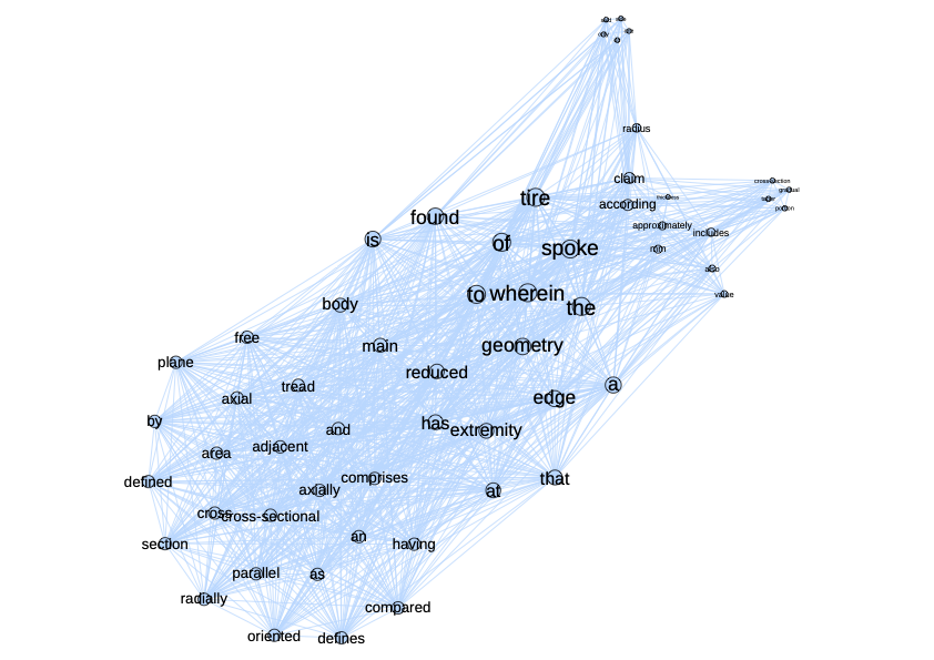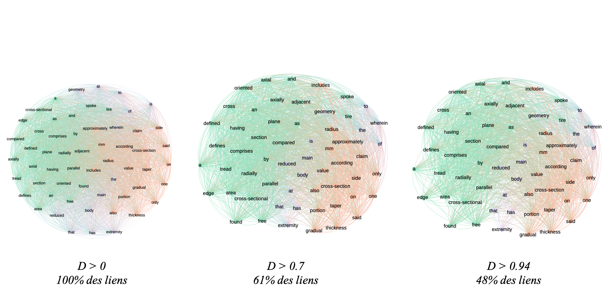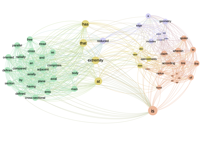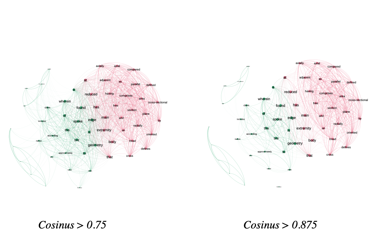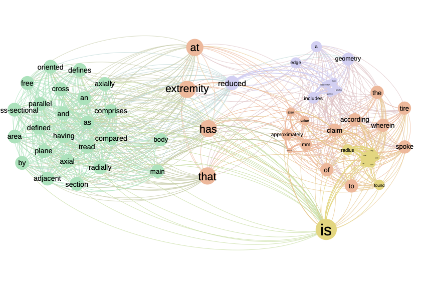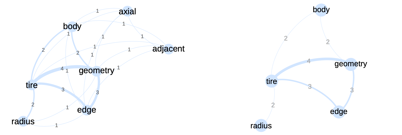 The raw indicator transforms this matrix into a network with a weight on the links corresponding to the number of co-occurrences. In the \(\ref{nw_semantic_raw}\) we represent this matrix as a network. On the left, all terms are present, while on the right, weak co-occurrences have been removed. By playing with the weights in this way, we can highlight the core of the subject. Here, the texts deal with tire geometry, which is at the heart of the network. More peripheral elements such as the tire body or radius are also visible.