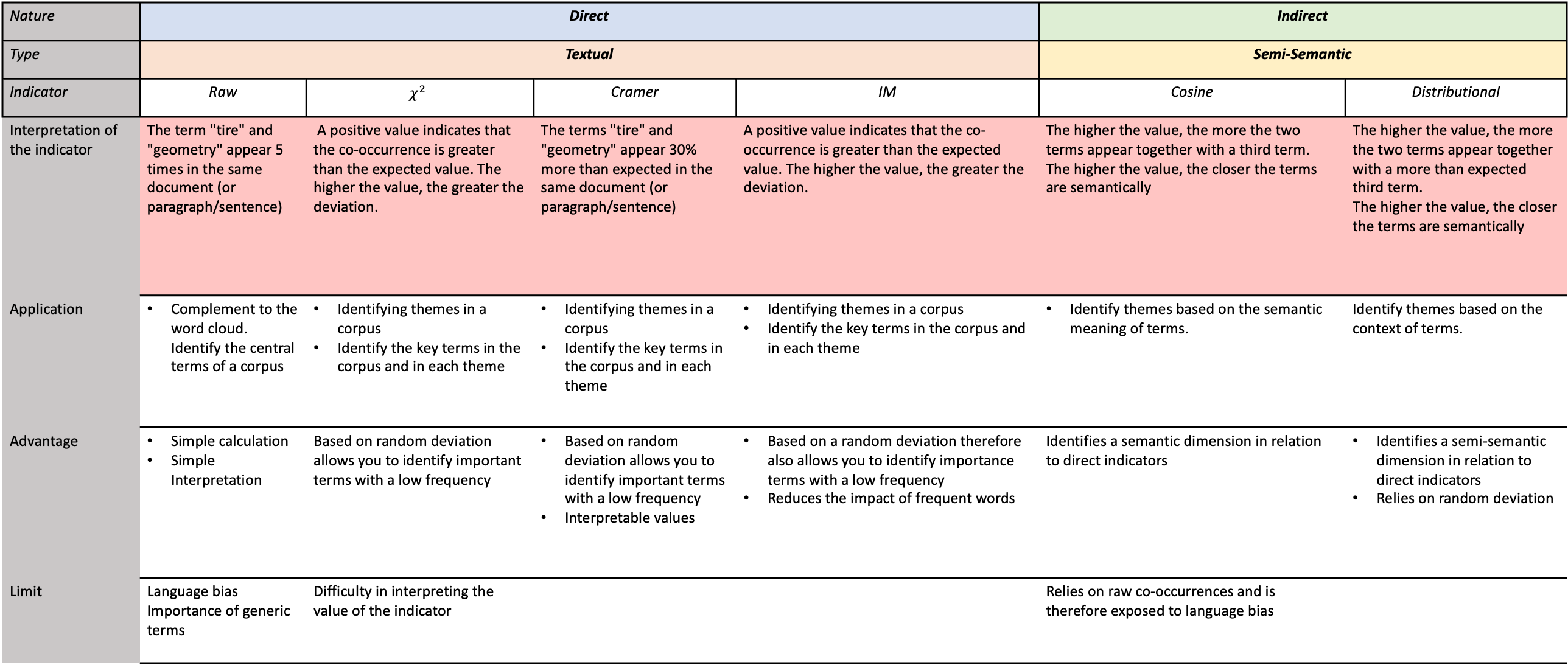 This table summarizes the use of all the indicators presented. The nature of the indicator depends on the type of link analyzed: direct, meaning that we’re looking at terms that appear together; indirect, meaning that we’re looking at terms that appear together with a third term. We make a distinction here between textual and semantic, as the interpretation of the results is not the same.