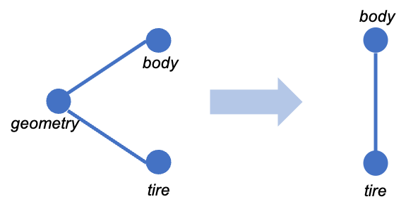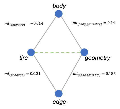 To illustrate the calculation, we calculate the score for the terms “tire” and “geometry” in figure \(\ref{illu_lien_indirecte}\). In the figure, the scores correspond to the mutual information scores.