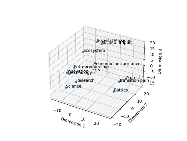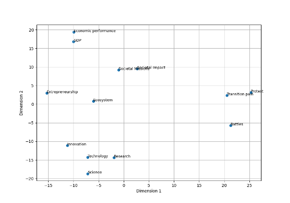 First up are the embeddings we want to use for the data. Embeddings in text mining are representations of words or phrases in a numerical form. These numerical representations capture the semantic meaning of the words or phrases, allowing machines to understand and process text more effectively. Think of embeddings as a way to convert words into vectors of numbers, where similar words are represented by similar vectors. This enables algorithms to analyze, compare, and make predictions based on the meaning of the text rather than just the raw text itself. There are multiple ways to do this, some embeddings have specific purposes (models for patents for instance), others are more general, some focus on one language, others on multiple. In the following image some words are positioned in space. The closer the words, the more proximity between them. What we download are basically the coordinates of the words in this space and replace each word with it’s coordinates. Doing this allows us to take into account the distance between the words rather than considering each word at the same distance from each other word.