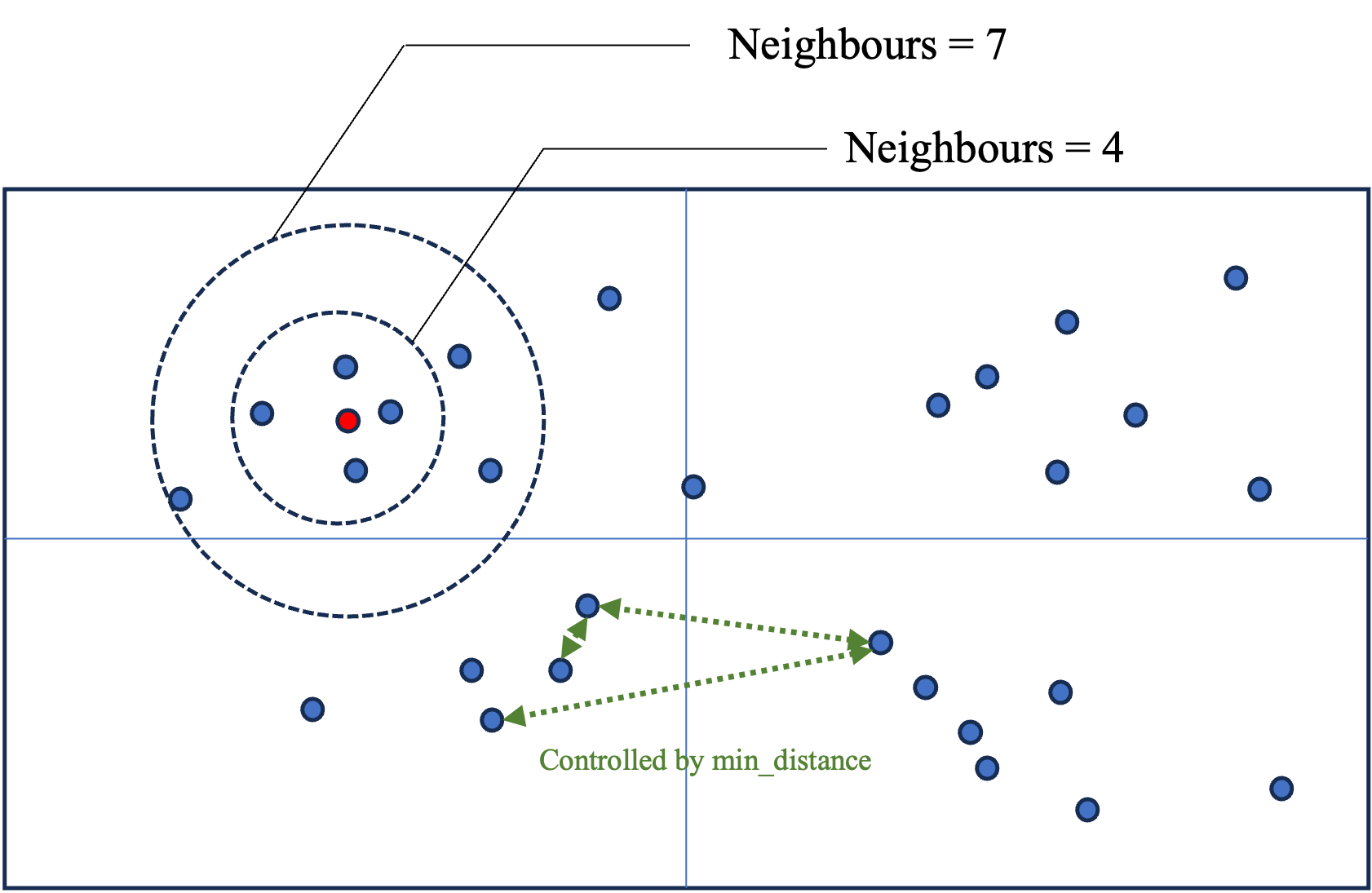 In the following figure we give an intuition for what these parameters do. The n_components defines the dimension of the space (2 in the figure). n_neighbors defines how far to search for points (represented by the circles). min_distance controls how closely we will search for points to reduce the dimension (green arrows), the higher the value, the further away we search, the broader the clusters and therefore, the topics.