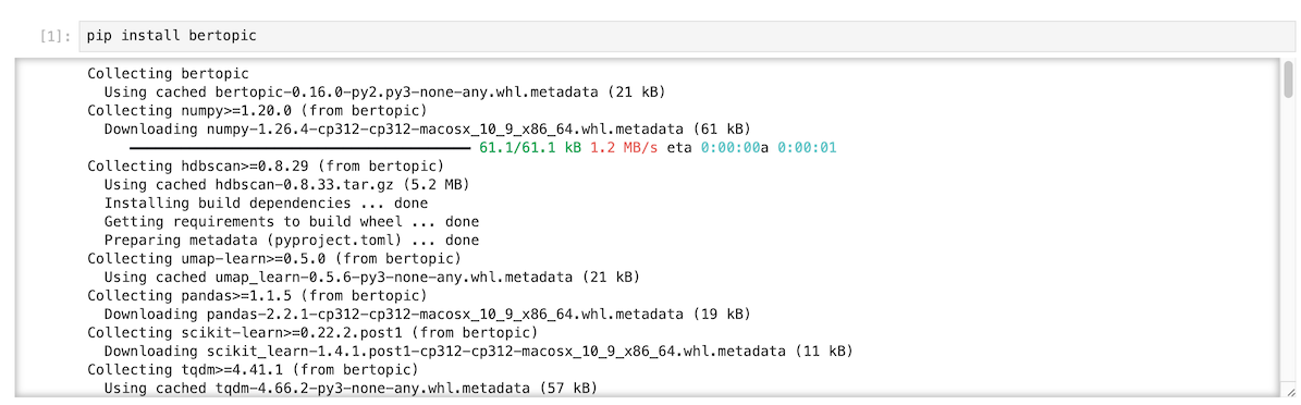 To install bertopic in our environment use pip as shown below, between brackets you should see the * appear indicating that the code is running, and slowly you will see the different steps appearing underneath the code block: