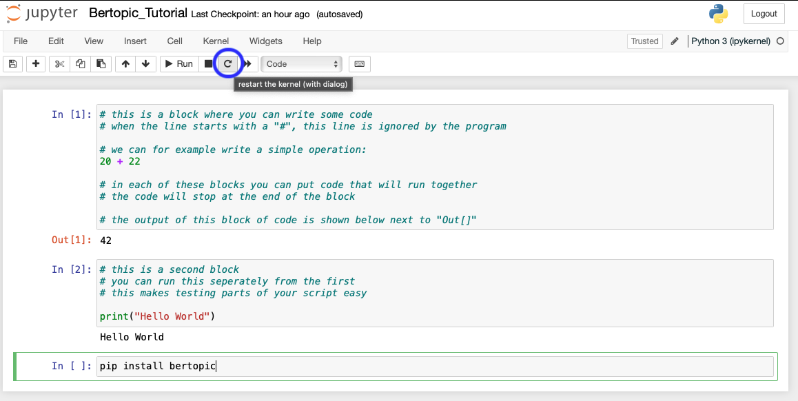 Once all the packages are installed we reload the kernel so that everything will be available for use. Click on the circular arrow in the menu: