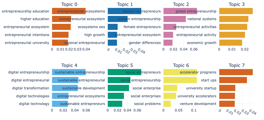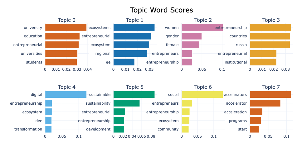 Beyond this visualisation we usually want to know which words constitute these topics. We can do this by creating a barplot of the words: