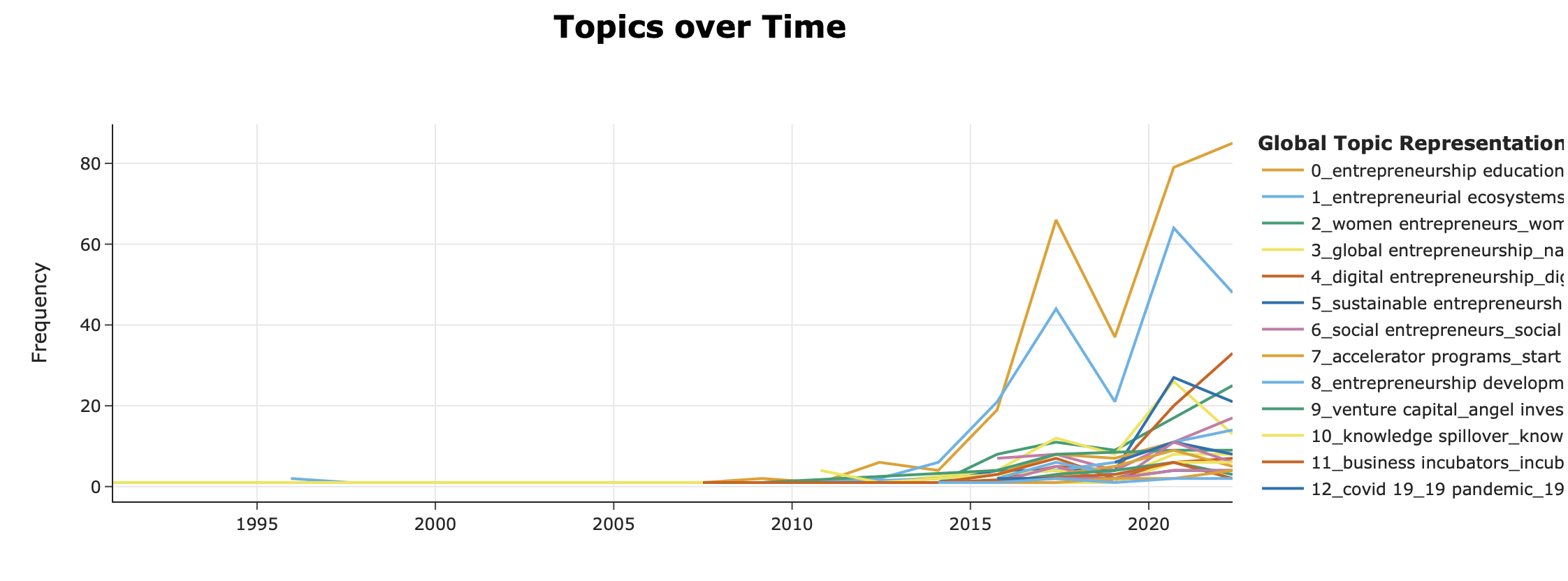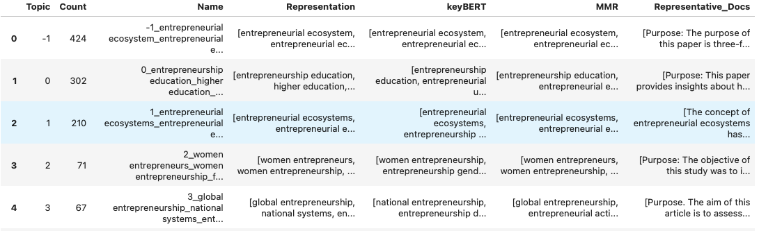 Based on the results of these topics we can go back to the parameters and adjust the model to improve the output. Once we are happy with the results, we can export the topics and connect them with other variables. Bertopic exports the results in the same order as the input data, topics can therefore be combined directly with the intial dataframe that we have been working with.