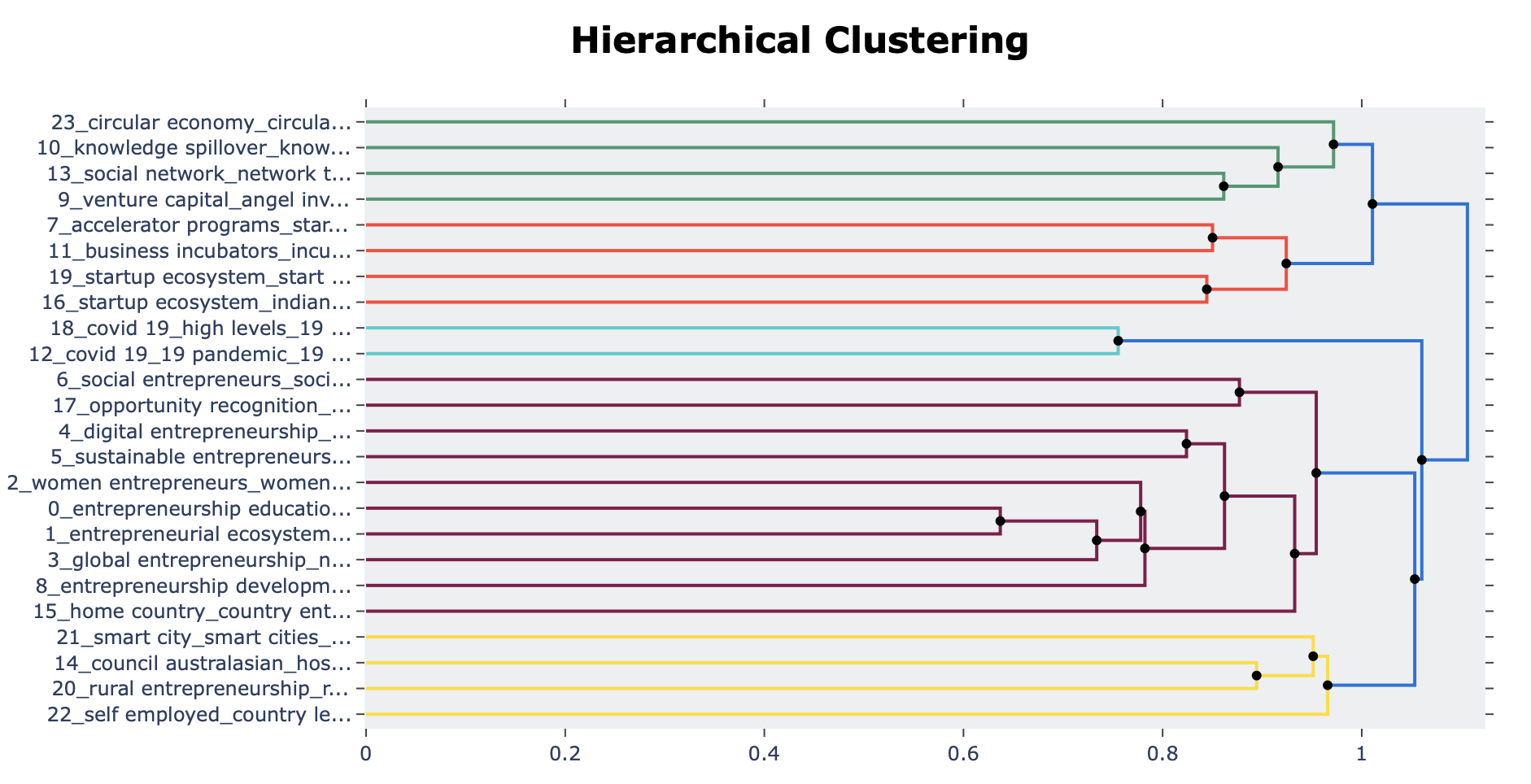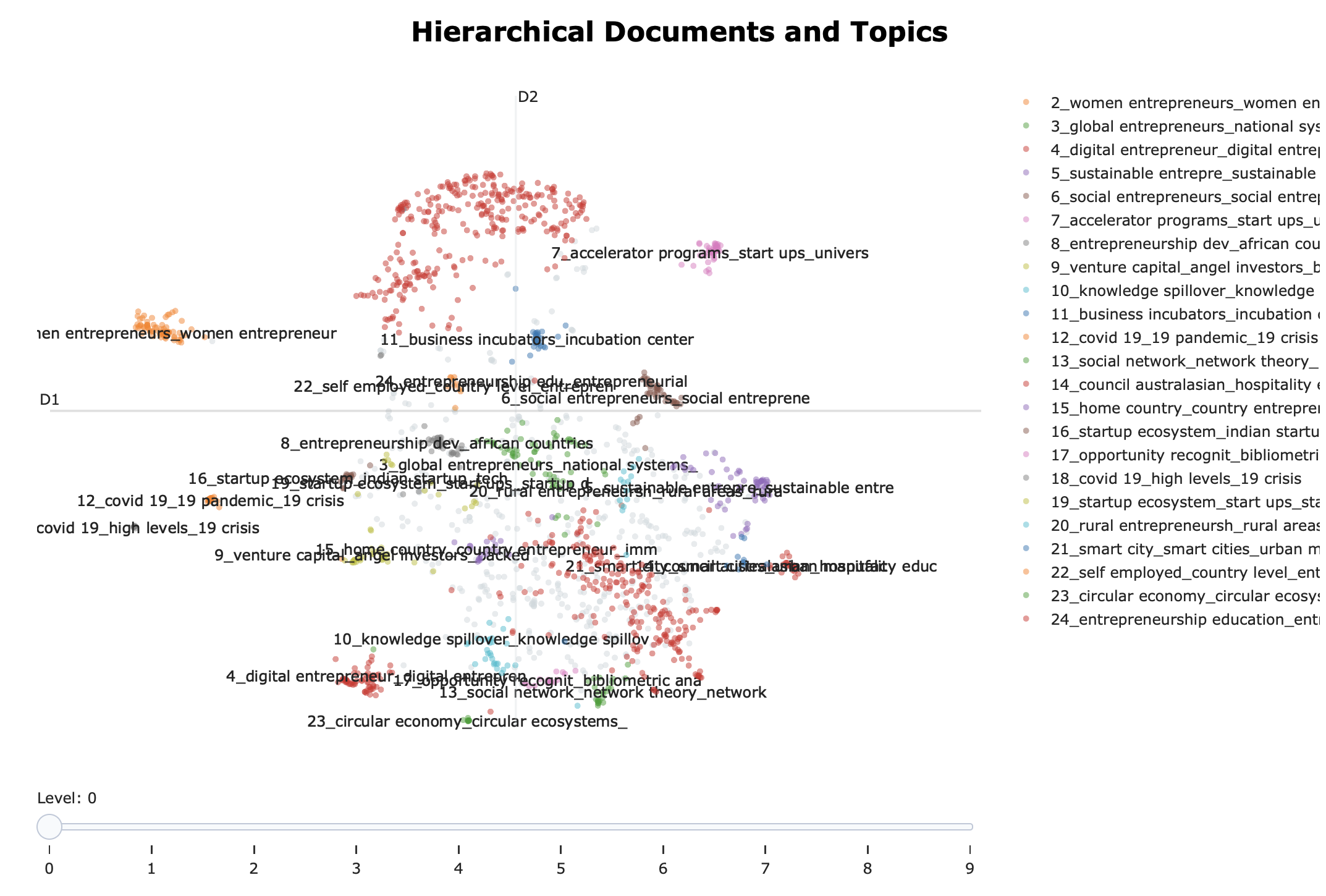 BERTopic allows for a specific type of topic model which takes a hierachy of topics into account. This allows us to visually check what level of aggregation suits us best.