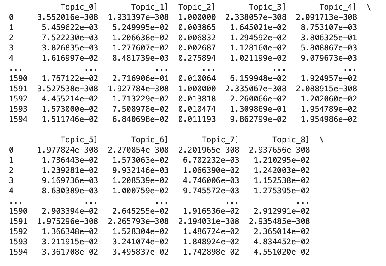 Topic_distribution = pd.DataFrame(probs, columns = [f"Topic_{i}]" for i in range(probs.shape[1])])