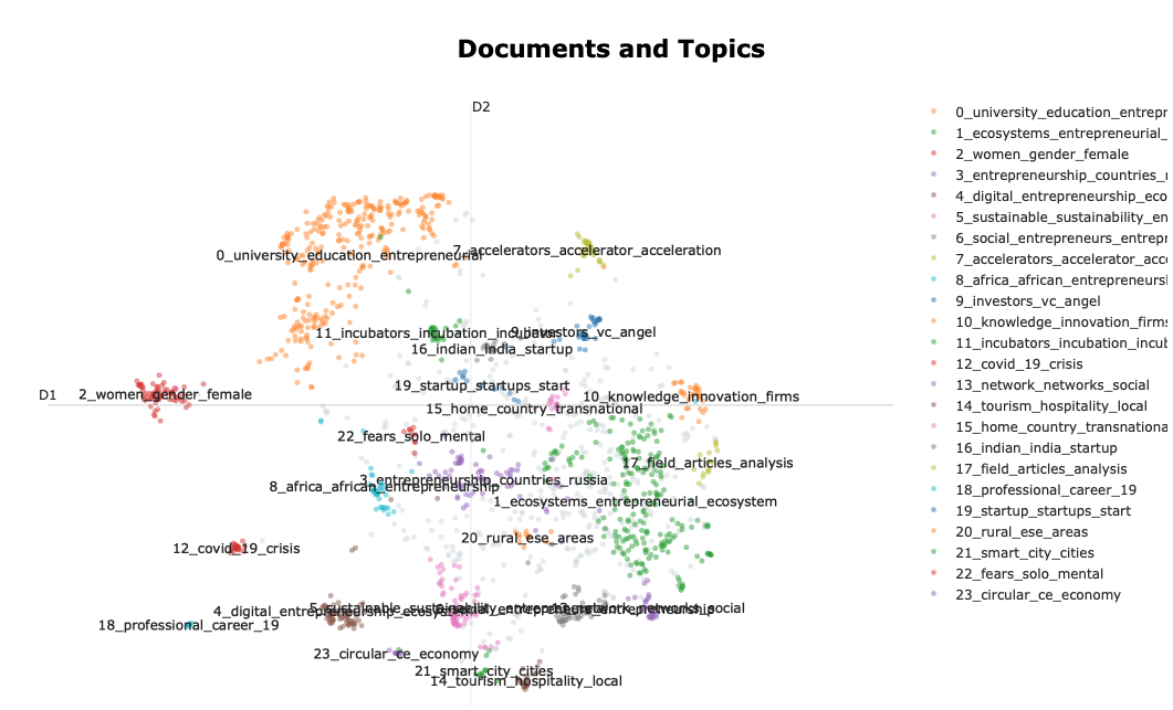 In this space, each dot is a document. The color of the document represents its cluster/topic. The distance between the documents should be interpreted in terms of a semantic proximity between the documents.